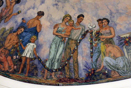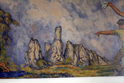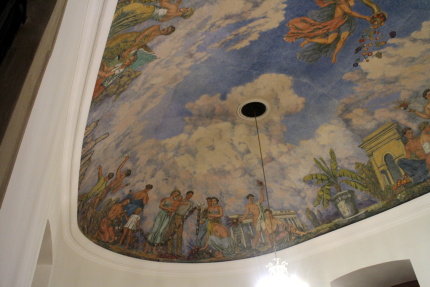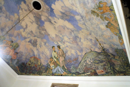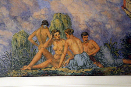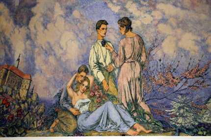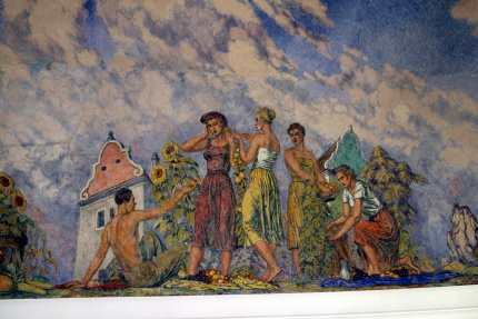 Když v dubnu 1945 takřka do základů vyhořel zámek v Mikulově, nikdo asi netušil, jak a kdy bude obnoven. V roce 1948 se začalo s opravou předzámčí díky Spolku pro obnovu mikulovského zámku. Od roku 1951 pak k rekonstrukci vnitřního areálu zámku prováděné podle projektu architekta Otakara Oplatka (1907-1985), dokončené o deset let později. Součástí obnovy interiérů je i nová podoba sálu předků, který byl vyzdoben monumentální freskou Rudolfa Gajdoše (1908 – 1975). V rámci naší účasti na 33. Mikulovském sympoziu jsme ji měli možnost po několik hodin důkladně zkoumat. Napadlo nás, že se o ni musíme podělit s širším okruhem případných zájemců. Takže Vám, milí čtenáři, přinášíme alespoň něco fotografií, abyste viděli, jak také může vypadat socialistický realismus…Kromě lepých mládenců a děv, lze studovat i místní, či blízké pamětihodnosti. Člověk si až říká, jaká je škoda, že se nenarodil dřív, co všechno mohl zažít! Zatímco na Západě „řádili“ v 60. letech hippies, u nás se po venkově proháněli adamité a hlavně adamitky a všechno bylo všech...ostatně onehdy jsem v jedné vesnici na Litomyšlsku slyšel, že jedna místní sedlácká rodina vstoupila do družstva, protože mužská část si myslela totéž, že všechno bude všech, včetně žen.